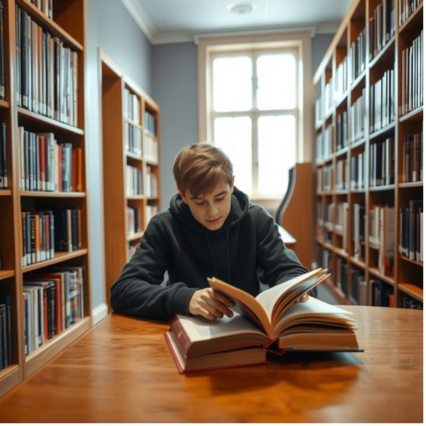 Crear una imagen de un adolescente leyendo un libro en una biblioteca pequeña