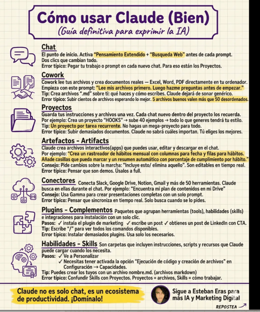 Claude es tu nuevo equipo de trabajo. Activa siempre el Pensamiento Extendido y la Búsqueda Web. Usa los Proyectos para que la IA recuerde tu estilo y tus archivos. No pegues lo mismo cada vez. Es una pérdida de tiempo. Prueba los Artefactos para crear apps interactivas en segundos. Y conecta tu Drive o Notion para trabajar con datos reales. Pasa de un chat básico a todo un ecosistema de productividad.
